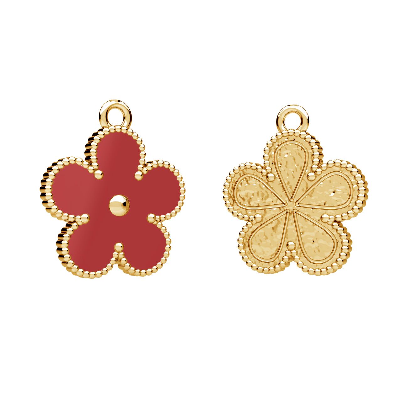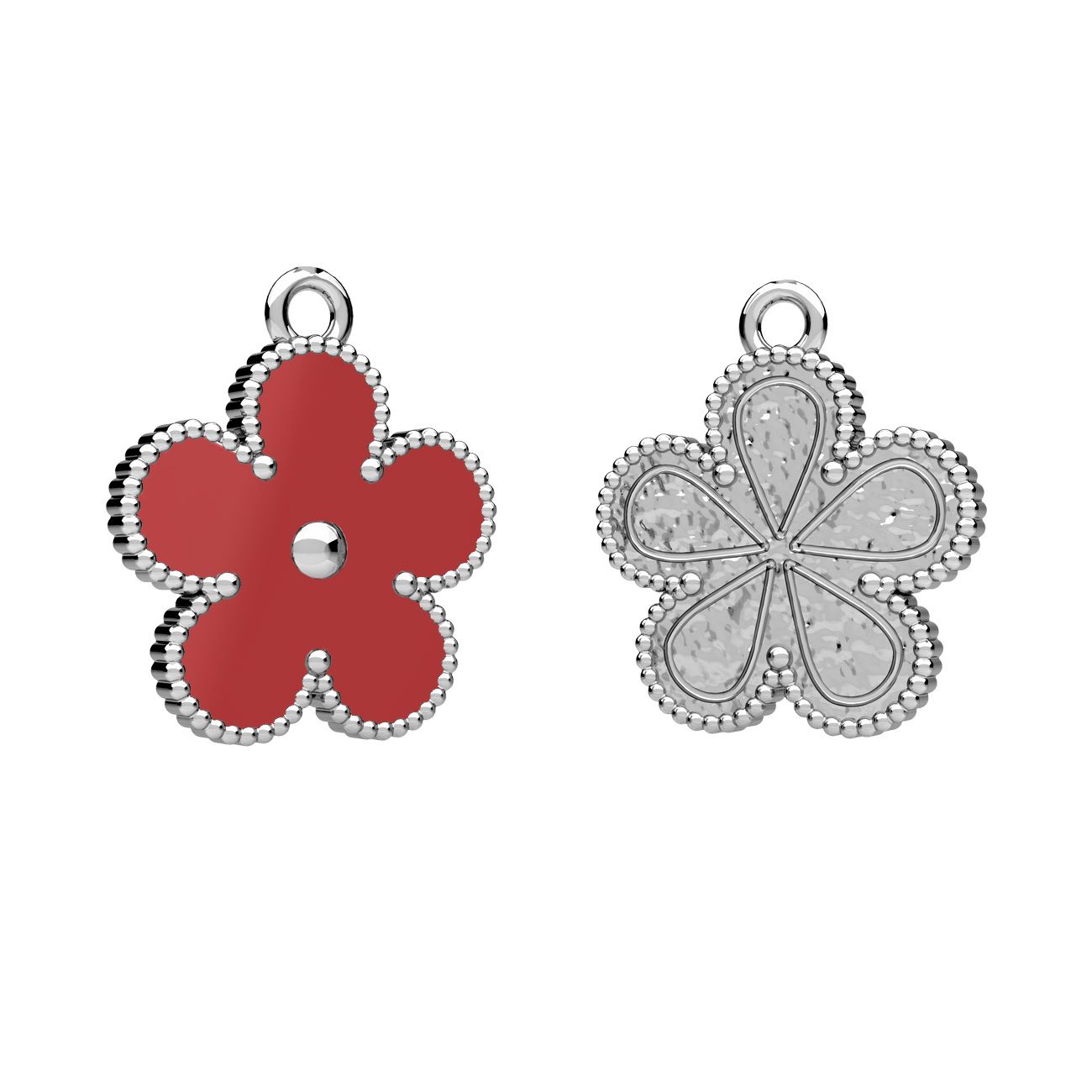 Zawieszka przedstawia kwiatek niezapominajki wykonany z srebrnej bazy wypełnionej czerwoną żywicą. To delikatne i eleganckie akcesorium, które dodaje uroku i wyraża subtelność