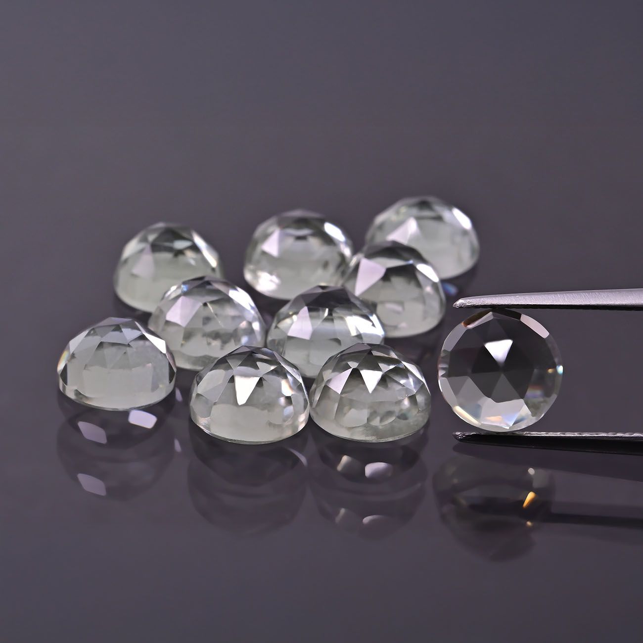 Rozeta z prasiolitu o średnicy 6 mm. Naturalny prasiolit wyróżnia się delikatnym, zielonym odcieniem oraz subtelnym połyskiem. Ten rzadki kamień jest odmianą kwarcu i symbolizuje równowagę oraz harmonię. Doskonały wybór do kolczyków, zawieszek i eleganckich bransoletek.