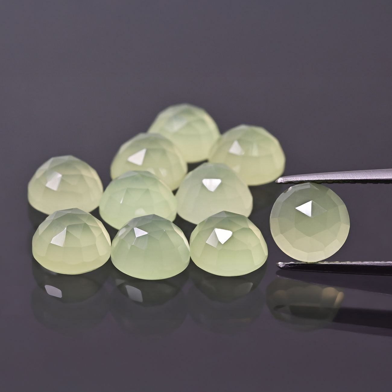 Agat seledynowy w szlifie ROSE CUT o wymiarze 6 mm. Naturalny kamień o subtelnym, zielonkawym odcieniu, fasetowany z płaskim spodem. Idealny do lekkiej, świeżej biżuterii.