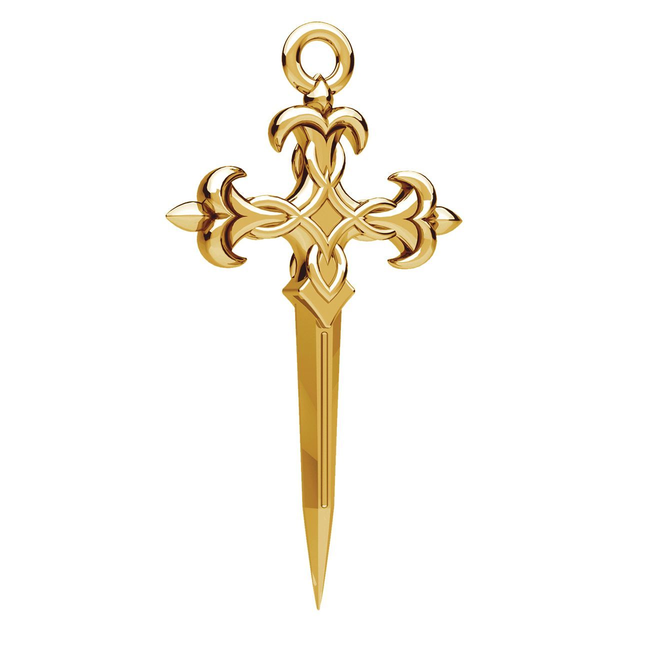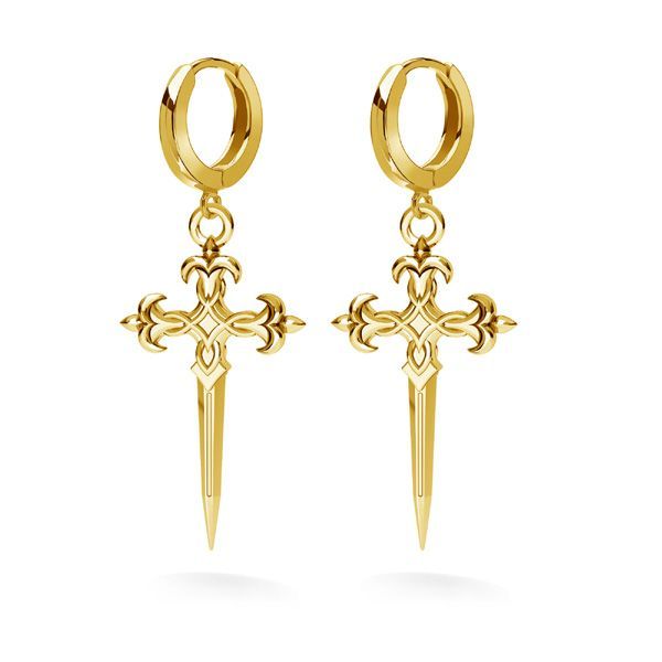 Zawieszka krzyż sztylet to wyrazisty motyw o dekoracyjnym i symbolicznym charakterze. Odlew z mosiądzu łączy formę krzyża, miecza i sztyletu, wzbogaconą o detal w kształcie lilijki. Głęboka forma podkreśla detale wzoru. Element przeznaczony głównie do naszyjników oraz kolczyków.